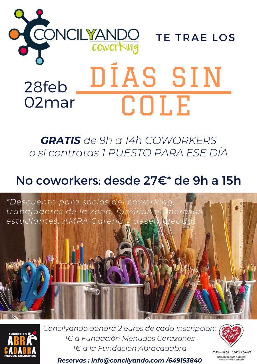 Los DÍAS SIN COLE en CONCILYANDO COWORKING nacieron porque uno de los objetivos que nos propusimos al arrancar este proyecto, y que da nombre también a nuestro espacio fue ayudar a conciliar a los trabajadores y trabajadoras que decidieran instalarse aquí.