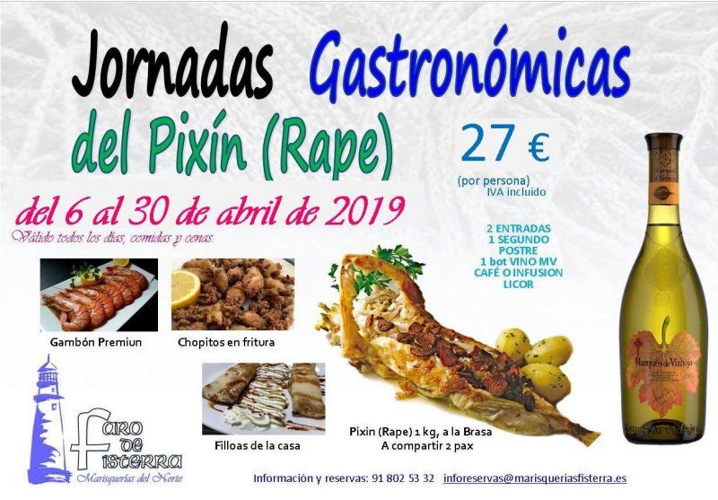 No te puedes perder las jornadas Gastronómicas del Pixín (Rape) que nos ha preparado Marisquería Faro de Fisterra en Alcala de Henares. Válido todos los días, comidas y cenas del 6 al 30 de abril de 2019.